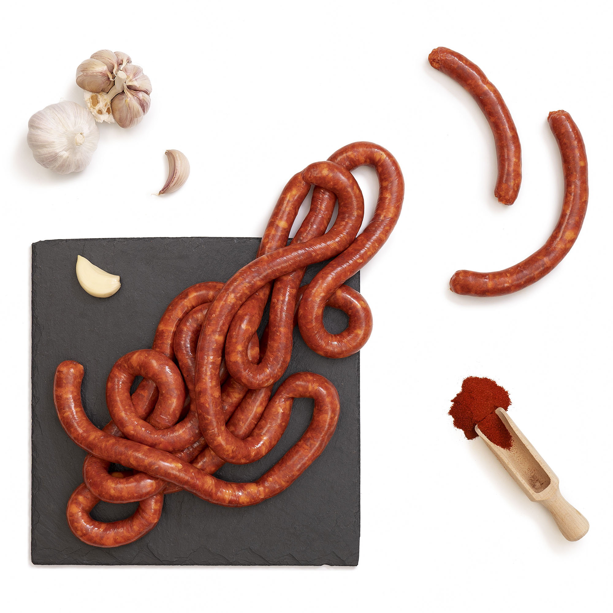 La longaniza roja es un embutido fresco típico de la gastronomía española, especialmente popular en la Comunidad Valenciana. Está elaborado con carne de cerdo magra, sazonada con especias y pimentón que le otorgan su distintivo color rojo y sabor intenso. Ideal para asar, freír o disfrutar en guisos tradicionales.